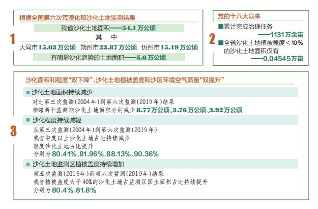 荒漠化是影響人類生存和發(fā)展的全球性重大生態(tài)問題。我省晉西北和晉北地區(qū)是全國(guó)荒漠化監(jiān)測(cè)與防治的重點(diǎn)地區(qū)之一。經(jīng)過長(zhǎng)期積極探索,不斷創(chuàng)新機(jī)制和科學(xué)防沙治沙,我省實(shí)現(xiàn)了沙化面積和程度“雙下降”、沙化土地植被蓋度和沙區(qū)環(huán)境空氣質(zhì)量“雙提升”的實(shí)際成效。