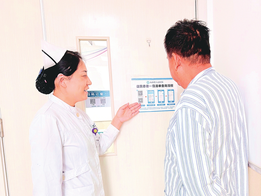 山西省人民醫(yī)院的護(hù)士正在為患者講解“無(wú)陪護(hù)理”的相關(guān)住院流程。本報(bào)記者王佳攝