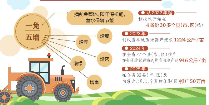“一免五增”藝機(jī)一體化技術(shù)由山西農(nóng)大(省農(nóng)科院)有機(jī)旱作農(nóng)業(yè)研究院任志強(qiáng)科研團(tuán)隊(duì)實(shí)踐研發(fā)。其核心理念是通過(guò)農(nóng)藝農(nóng)機(jī)結(jié)合、良種良法配套,有效提高作物抗旱出苗、蓄水保墑和水肥利用率,秸稈自然腐熟,增強(qiáng)抗病性和抗倒性,從而通過(guò)增加密度助力單產(chǎn)提升,實(shí)現(xiàn)節(jié)本提質(zhì)增效和綠色可持續(xù)生產(chǎn)。該技術(shù)針對(duì)半干旱地區(qū)玉米生產(chǎn)中出苗難、秸稈還田成本高、機(jī)械作業(yè)成本高等問(wèn)題,依托一體化農(nóng)機(jī)具實(shí)施保護(hù)性耕作,從而實(shí)現(xiàn)“一免五增”?!耙幻狻奔床デ懊庹兀裟晟钏煞?,蓄水保墑節(jié)能?!拔逶觥奔础霸鰤劇保瑴喜ヌ綁?,壟溝集雨,抗旱保苗;“增養(yǎng)”,秸稈歸壟腐熟,菌肥同播,培肥地力;“增密”,增株抗倒耐密,增加畝穗數(shù);“增綠”,測(cè)土分次施肥,增加穗粒數(shù),機(jī)械除草節(jié)肥藥;“增重”,一噴多促,延遲收獲增粒重。