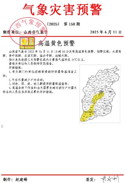 山西省氣象臺2025年06月11日10時00分發(fā)布高溫黃色預警,預警區(qū)域:太原南部、晉中西部、呂梁東部、臨汾中部、運城大部。
