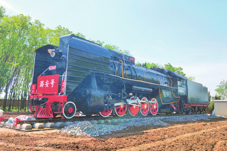 如今,大東溝成了煤礦生產(chǎn)設備的“露天博物館”,陳列著井下使用過的綜采支架、掘進機、齒軌車、風機、高壓開關、移動變電站、礦用潛水泵等40余種、近300件設備,為中國煤礦不同歷史發(fā)展階段保留了珍貴標本。其中,有兩處展品更為引人注目:一是一臺時速80公里、牽引力324千牛的前進型蒸汽機車,1975年由大同機車廠生產(chǎn),1994年由潞安集團統(tǒng)一安排承擔石圪節(jié)煤礦和兄弟礦井的煤炭外運及漳澤電廠的煤炭直送任務,是潞安集團首批鐵路運輸牽引機車,直到2007年機車轉型升級后停用。如今,這臺蒸汽機車已經(jīng)成為一代人的記憶,也是不少人打卡的網(wǎng)紅地標。還有一處是給人留下深刻印象的軌道墻。兩道長6米的水泥墻,墻體里鑲嵌著從石圪節(jié)井下運上來的標有不同年代的道軌,如產(chǎn)于1902年的德國道軌、產(chǎn)于1905年的比利時道軌、產(chǎn)于1915年的由漢陽鐵廠制造的道軌等。這些標有生產(chǎn)年代的道軌,當年在井下作為支撐物或巷道頂棚使用,如今成為石圪節(jié)煤礦發(fā)展歷程的見證,默默地向人們訴說石圪節(jié)開采歷史的久遠。