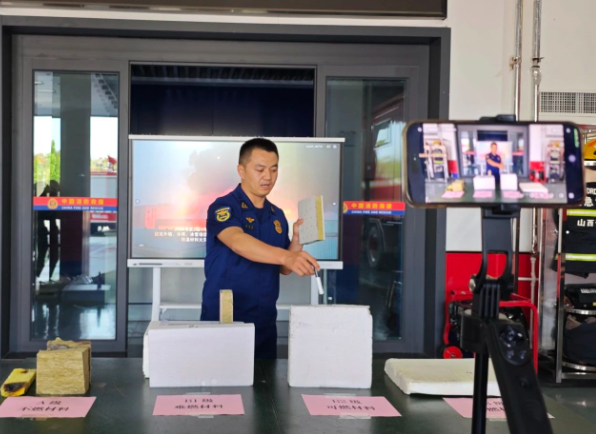 晉城、晉中消防陸續(xù)開展了線上直播活動,對不同材質的建筑保溫材料進行了防火性能對比實驗,進一步提升公眾對建筑保溫材料防火性能的認知,為建筑行業(yè)提供科學選材依據(jù),同時宣傳普及了電氣焊施工現(xiàn)場規(guī)范設置及安全管理知識,以減少相關火災事故的發(fā)生。 活動現(xiàn)場,消防救援人員詳細介紹了市面上常見的多種建筑保溫材料的種類及其燃燒性質,使群眾對這些材料的基本特性和耐火等級有了初步了解。隨后,進入直播的核心環(huán)節(jié)——燃燒對比實驗。實驗人員將8種保溫材料切割成相同尺寸的樣品并固定在實驗墻體上,依次進行點火實驗。通過直觀的實驗演示,群眾可清晰地看到不同保溫材料在火災中的截然不同表現(xiàn),深刻認識到選擇防火性能良好的保溫材料的必要性。 “零距離”宣傳護平安