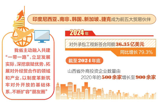 對外投資和工程承包業(yè)務同樣是我省共建“一帶一路”的一大亮點。2024年不斷完善海外綜合服務體系,非金融類直接投資達6517萬美元,同比大增408.7%。這表明山西省企業(yè)加快了“走出去”的步伐,積極在海外布局,拓展國際投資領域,尋求更廣闊的發(fā)展空間和資源。同時,對外承包工程新簽合同額36.35億美元,同比增長79.3%。截至2024年底,山西省外商投資企業(yè)數(shù)量由2020年的500余家增長至900余家。