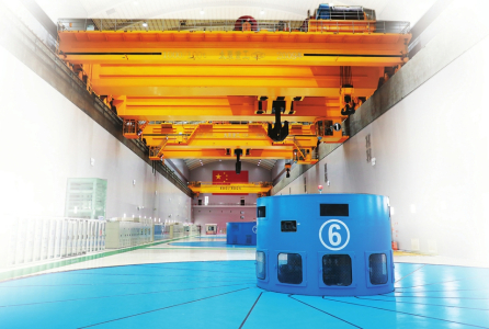 踏入這座智能化水平位居世界前列的水電站主廠房,映入眼簾的是震撼的工業(yè)圖景,耳中持續(xù)回響側(cè)排電箱發(fā)出的規(guī)律嗡鳴。廠房上空數(shù)十米處,太重研制的兩臺1000t橋式起重機正有條不紊地吊起巨大構(gòu)件緩緩掠過高空,精準地運往指定地點。沒有想象中的劇烈震顫與遲緩操作,所有動作都流暢而精準,令人贊嘆。