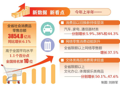數(shù)據(jù)顯示,上半年,全省社會(huì)消費(fèi)品零售總額3854.8億元,同比增長(zhǎng)6.1%,較一季度加快0.2個(gè)百分點(diǎn),高于全國(guó)平均水平(5.0%)1.1個(gè)百分點(diǎn),全國(guó)排名第10位,消費(fèi)主引擎作用日益凸顯,為全省經(jīng)濟(jì)高質(zhì)量發(fā)展提供有力支撐。