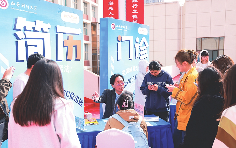在山西財經(jīng)大學(xué)2025屆畢業(yè)生春季雙選會現(xiàn)場,學(xué)生們正在聽老師分析求職簡歷中的問題(資料圖片)。
