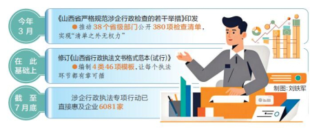 建立執(zhí)法清單,規(guī)范執(zhí)法行為。今年3月,省政府辦公廳印發(fā)《山西省嚴(yán)格規(guī)范涉企行政檢查的若干舉措》,推動38個省級部門公開380項檢查清單,實現(xiàn)“清單之外無權(quán)力”。同時,省司法廳推動各級行政執(zhí)法部門制定并公布年度行政檢查工作計劃,合理確定本單位對同一企業(yè)實施行政檢查的年度頻次上限,以及行政執(zhí)法部門的職責(zé)邊界。目前,已有21個省級行政檢查主體公布了行政檢查年度頻次上限,全省上半年涉企檢查總量同比下降36%。在此基礎(chǔ)上,修訂《山西省行政執(zhí)法文書格式范本(試行)》,編制4類46項模板,讓每個執(zhí)法環(huán)節(jié)都有章可循,進一步規(guī)范執(zhí)法行為。