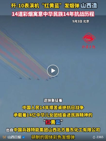 閱兵式上,10時(shí)25分左右,殲-10表演機(jī)從天空呼嘯而過,留下14條絢麗奪目的彩煙——這抹象征著中國人民14年艱苦卓絕抗日戰(zhàn)爭(zhēng)、承載著14億中華兒女團(tuán)結(jié)奮進(jìn)民族精神的“紅黃藍(lán)”,出自中國兵器特能集團(tuán)山西北方晉東化工有限公司(以下簡(jiǎn)稱“晉東公司”)研制的固體彩色發(fā)煙彈。