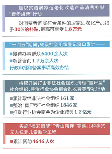 “十四五”期間,我省堅(jiān)持“規(guī)范與發(fā)展并重、監(jiān)管與服務(wù)并舉”,持續(xù)深化改革,健全體制機(jī)制,完善政策措施,推動(dòng)社會(huì)組織高質(zhì)量發(fā)展取得新成效。推行“零見面審批、最多跑一次”和線上年報(bào)“零跑動(dòng)”,省、市、縣三級社會(huì)組織登記實(shí)現(xiàn)“一網(wǎng)通辦”。統(tǒng)一規(guī)范申請材料、表格表單、辦事流程、章程文本等,政務(wù)服務(wù)標(biāo)準(zhǔn)化、規(guī)范化水平持續(xù)提升。推進(jìn)社會(huì)組織規(guī)范化建設(shè),健全綜合監(jiān)管、聯(lián)合執(zhí)法、資金管理等制度機(jī)制,加強(qiáng)對社會(huì)組織名稱、宗旨、業(yè)務(wù)范圍、發(fā)起人和擬任負(fù)責(zé)人的審核把關(guān),強(qiáng)化對社會(huì)組織內(nèi)部治理、人員、資金、活動(dòng)等日常監(jiān)管。持續(xù)開展打擊非法社會(huì)組織、清理“僵尸型”社會(huì)組織、整治行業(yè)協(xié)會(huì)商會(huì)亂收費(fèi)等專項(xiàng)行動(dòng),推動(dòng)行業(yè)協(xié)會(huì)商會(huì)為企業(yè)減負(fù)1.2億元。