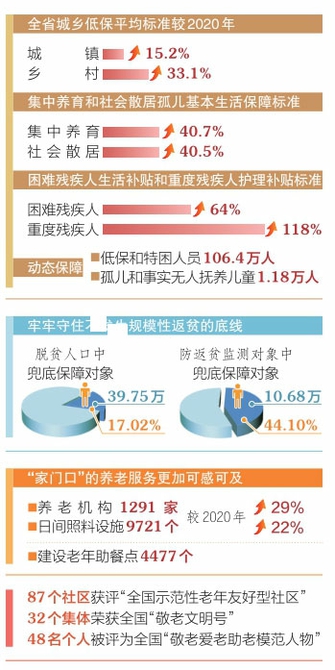“目前,全省城鄉(xiāng)低保平均標(biāo)準(zhǔn)分別達(dá)到每人每月669元、555元,已有11個(gè)縣(市、區(qū))實(shí)現(xiàn)城鄉(xiāng)低保標(biāo)準(zhǔn)相統(tǒng)一?!笔∶裾d黨組書記、廳長李建紅介紹,我省建立最低生活保障標(biāo)準(zhǔn)與人均消費(fèi)支出掛鉤的動(dòng)態(tài)調(diào)整機(jī)制,從2022年起,各縣(市、區(qū))城鄉(xiāng)低保標(biāo)準(zhǔn)分別按當(dāng)?shù)厣夏甓瘸青l(xiāng)居民人均消費(fèi)支出的30%—40%和45%—55%確定。