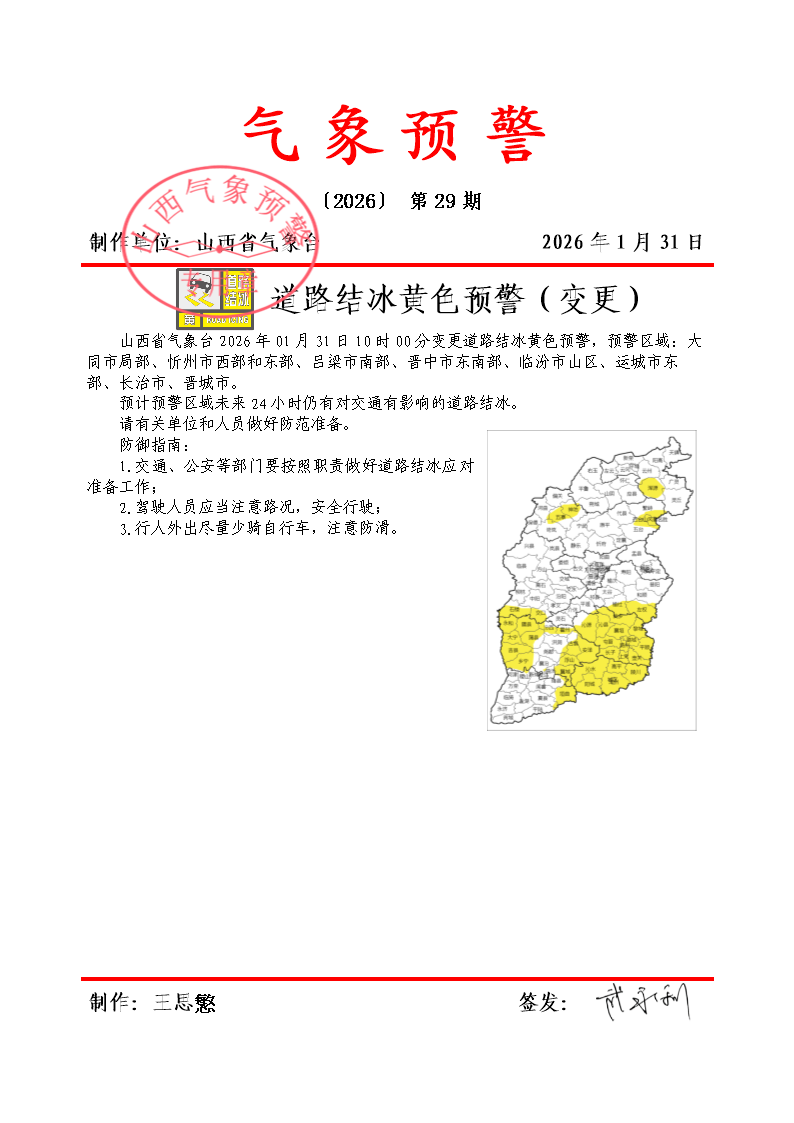山西省氣象臺2026年01月31日10時00分變更道路結(jié)冰黃色預(yù)警,預(yù)警區(qū)域:大同市局部、忻州市西部和東部、呂梁市南部、晉中市東南部、臨汾市山區(qū)、運城市東部、長治市、晉城市。預(yù)計預(yù)警區(qū)域未來24小時仍有對交通有影響的道路結(jié)冰。請有關(guān)單位和人員做好防范準(zhǔn)備。防御指南:1.交通、公安等部門要按照職責(zé)做好道路結(jié)冰應(yīng)對準(zhǔn)備工作;2.駕駛?cè)藛T應(yīng)當(dāng)注意路況,安全行駛;3.行人外出盡量少騎自行車,注意防滑。 (責(zé)任編輯:盧相?。?/span> |