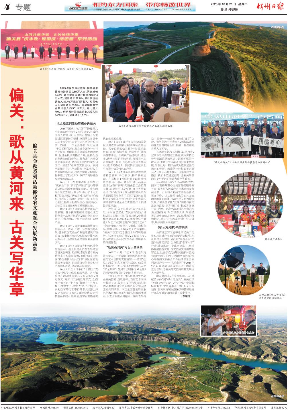 2025年國慶中秋“雙節(jié)”恰逢第八個(gè)中國農(nóng)民豐收節(jié),偏關(guān)縣委、縣政府為深入貫徹習(xí)近平總書記考察山西重要講話重要指示精神,全面落實(shí)省委十二屆十次全會(huì)、市委五屆九次全會(huì)和縣委十四屆十一次全會(huì)部署,學(xué)習(xí)運(yùn)用“千萬工程”經(jīng)驗(yàn),助力城鄉(xiāng)融合與鄉(xiāng)村產(chǎn)業(yè)振興,賦能偏關(guān)農(nóng)文旅深度融合發(fā)展,促進(jìn)金秋消費(fèi)提質(zhì)升級(jí),激揚(yáng)全縣奮發(fā)進(jìn)取的創(chuàng)新合力,努力讓廣大群眾共享幸福生活,特組織開展“慶豐收·迎國慶·話團(tuán)圓”系列農(nóng)文旅活動(dòng)。系列活動(dòng)組織有力、氣勢恢宏、豐富多彩,在塑造偏關(guān)新形象、打造文旅新品牌的征程中邁出了堅(jiān)實(shí)步伐,取得了良好社會(huì)反響和圓滿成功。