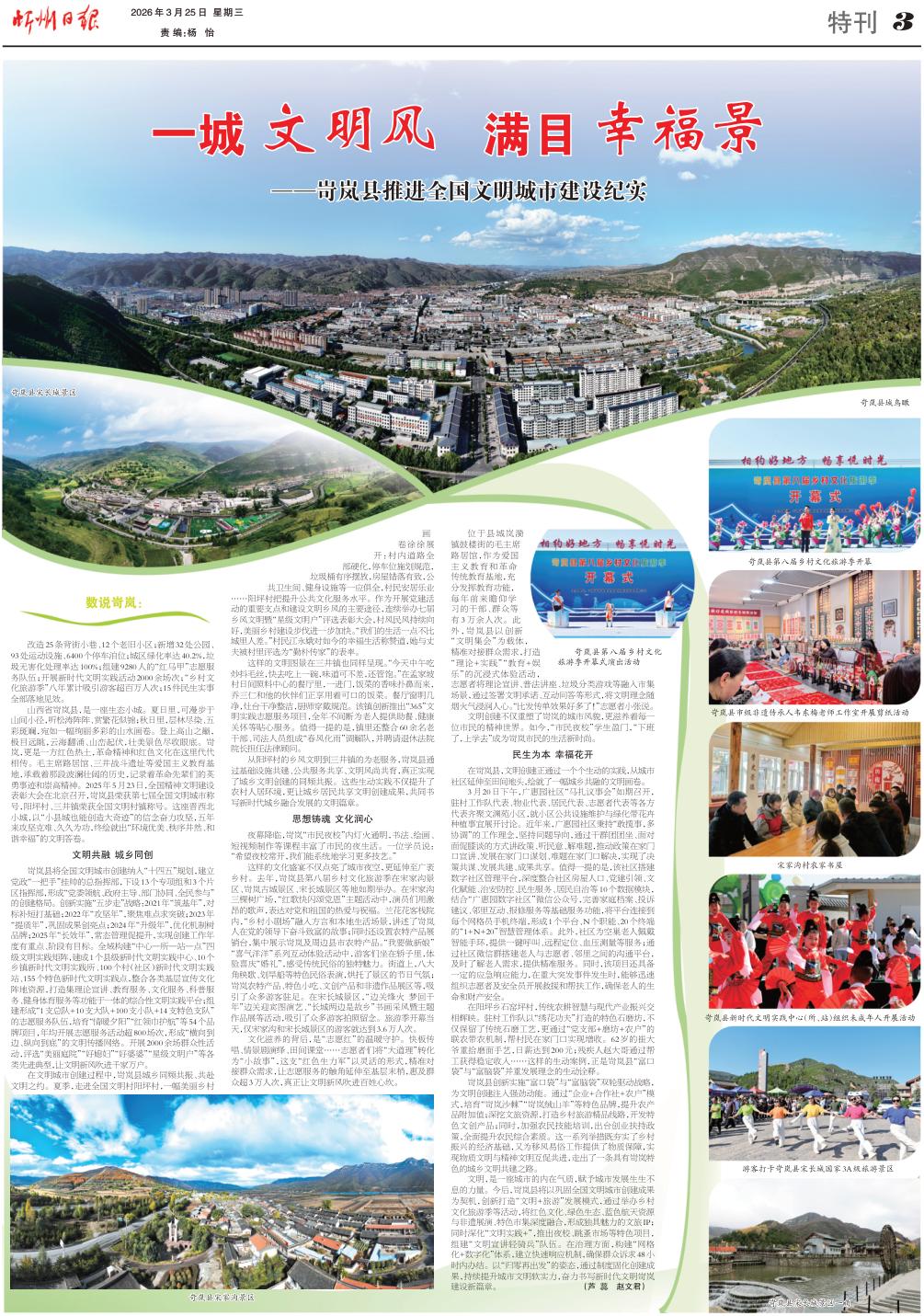 山西省岢嵐縣,是一座生態(tài)小城。夏日里,可漫步于山間小徑,聽松濤陣陣、賞繁花似錦;秋日里,層林盡染、五彩斑斕,宛如一幅絢麗多彩的山水畫卷。登上高山之巔,極目遠眺,云海翻涌、山巒起伏,壯美景色盡收眼底。岢嵐,更是一方紅色熱土,革命精神和紅色文化在這里代代相傳。毛主席路居館、三井戰(zhàn)斗遺址等愛國主義教育基地,承載著那段波瀾壯闊的歷史,記錄著革命先輩們的英勇事跡和崇高精神。2025年5月23日,全國精神文明建設表彰大會在北京召開,岢嵐縣榮獲第七屆全國文明城市稱號,陽坪村、三井鎮(zhèn)榮獲全國文明村鎮(zhèn)稱號。這座晉西北小城,以“小縣城也能創(chuàng)造大奇跡”的信念奮力攻堅,五年來攻堅克難、久久為功,終繪就出“環(huán)境優(yōu)美、秩序井然、和諧幸福”的文明答卷。