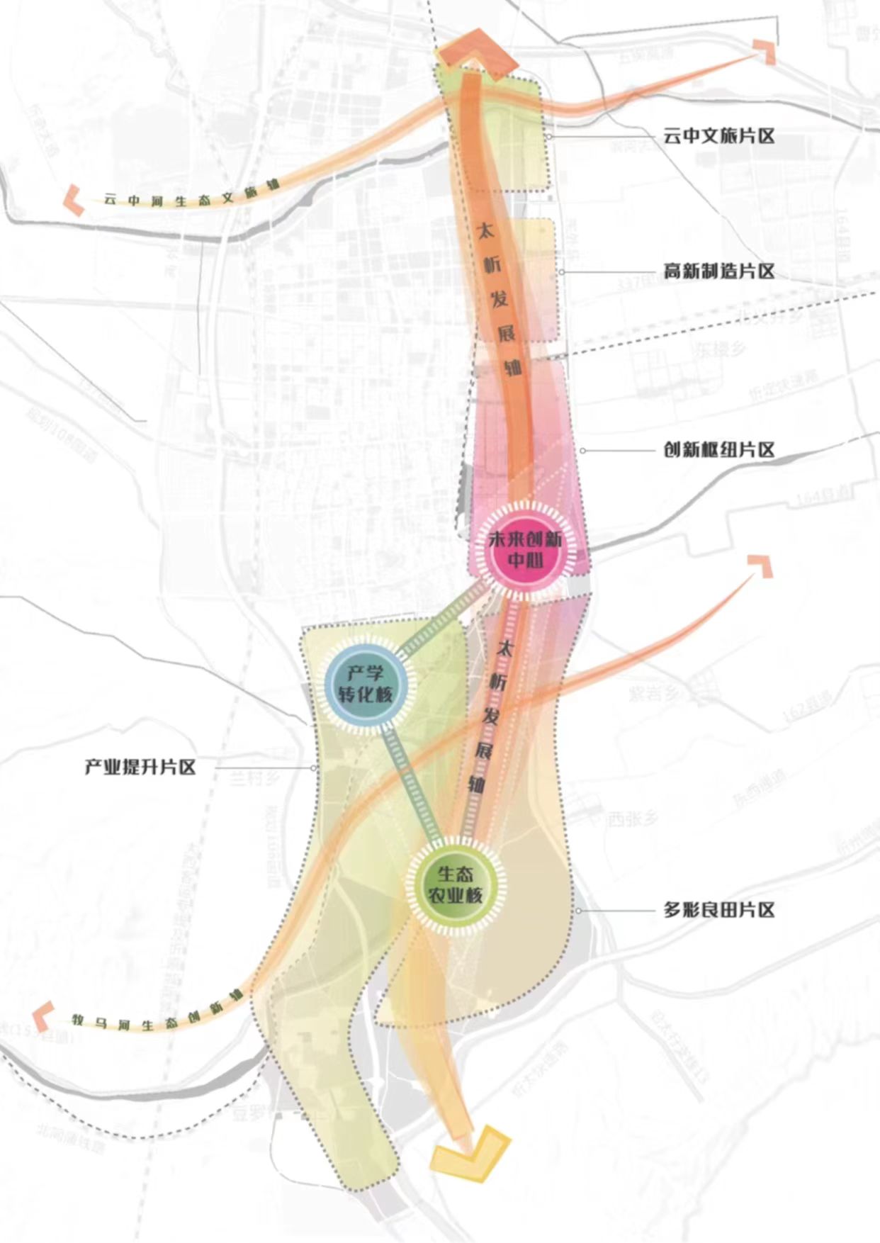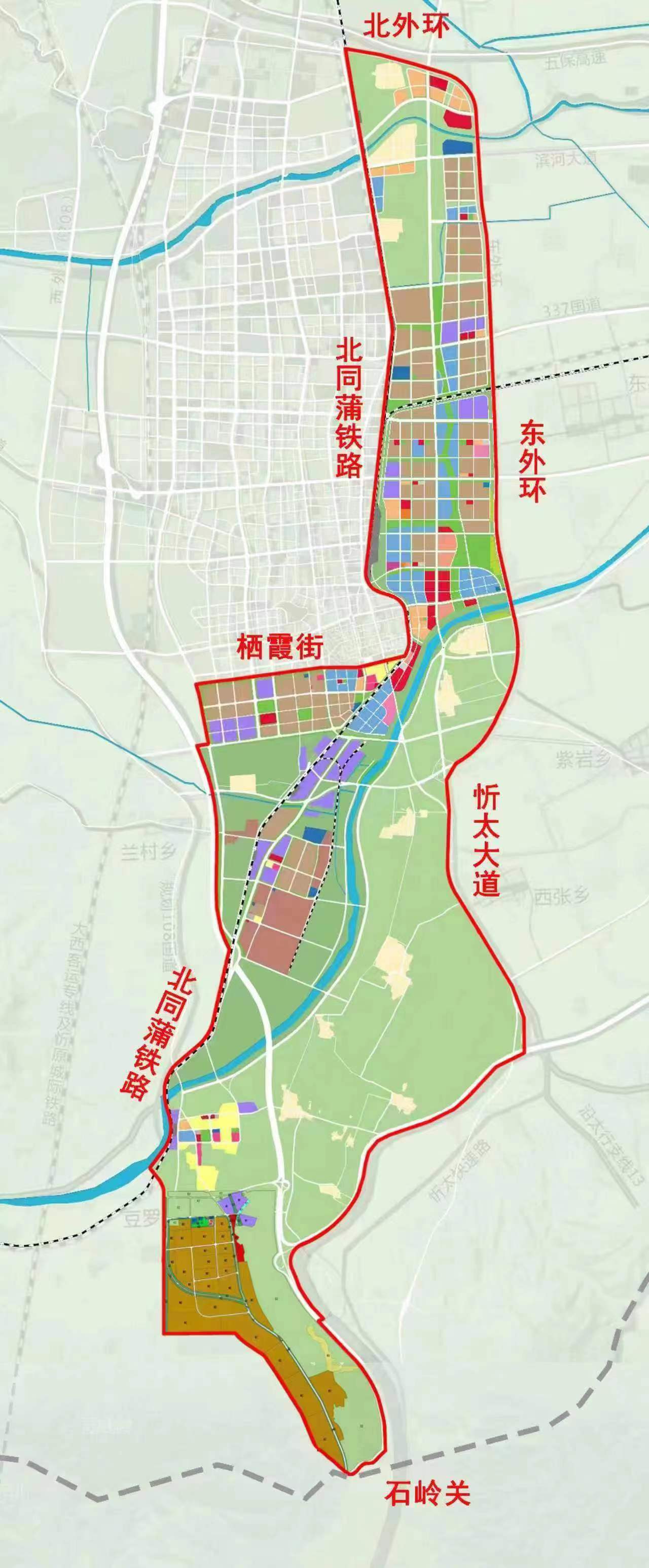 規(guī)劃面積約100平方公里,北至北外環(huán),南至石嶺關(guān)(太原界),西至北同蒲鐵路,東至東外環(huán)。新區(qū)作為太忻一體化經(jīng)濟(jì)區(qū)忻州片區(qū)的啟動(dòng)區(qū),堅(jiān)持生態(tài)優(yōu)先、綠色發(fā)展,統(tǒng)籌生活、生態(tài)、生產(chǎn)三大空間,以“一心雙核、三軸五片區(qū)”規(guī)劃布局,預(yù)留未來產(chǎn)業(yè)發(fā)展用地,重點(diǎn)發(fā)展雜糧產(chǎn)業(yè)、現(xiàn)代物流產(chǎn)業(yè)、新能源材料產(chǎn)業(yè)、文旅產(chǎn)業(yè)和科技創(chuàng)新智造產(chǎn)業(yè),北部打造高新制造集合體、云中河?xùn)|段打造休閑度假文旅區(qū)、中部打造創(chuàng)新樞紐核心區(qū)、西南部打造產(chǎn)業(yè)提升區(qū)、東南部打造多彩良田示范區(qū),形成與大盂產(chǎn)業(yè)新城南北呼應(yīng)之勢(shì)。
