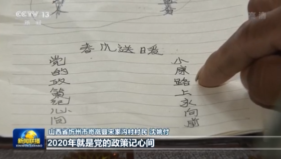 山西省忻州市岢嵐縣宋家溝村村民沈姚付:2019年我寫脫貧不忘共產(chǎn)黨,感恩四方,就是四面八方的游客來(lái)吃我的涼粉,也是幫助我脫貧。2020年就是黨的政策記心間,小康路上要永遠(yuǎn)向前,春風(fēng)送暖。