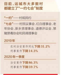 目前,運城市大多數(shù)村都建立了“一約七會”制度——“一約”是村規(guī)民約,“七會”是村民議事會、紅白理事會、老年協(xié)會、新鄉(xiāng)賢理事會、道德評議會、禁賭禁毒協(xié)會和民調(diào)理事會。這“一約七會”制度的不斷健全,對破除鄉(xiāng)村社會陋習(xí)、引導(dǎo)群眾移風(fēng)易俗、引領(lǐng)社會新風(fēng)、化解矛盾糾紛,維護(hù)基層社會和諧穩(wěn)定起到了重要作用。村民的正能量多了,鄉(xiāng)村的負(fù)面事情少了,社會治安狀況得到明顯改善,群眾安全感顯著增強。2019年運城市農(nóng)村治安案件同比下降31.2%,刑事案件下降14.3%;2020年一季度,治安案件下降86.3%,刑事案件下降59.7%。
