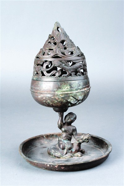 西漢鎏銀騎獸人物博山爐,河北博物館藏。1968年,河北滿城陵山二號漢墓發(fā)掘出土。在西漢,人們喜愛焚香熏煙,來驅瘟防疫,養(yǎng)生祛病。