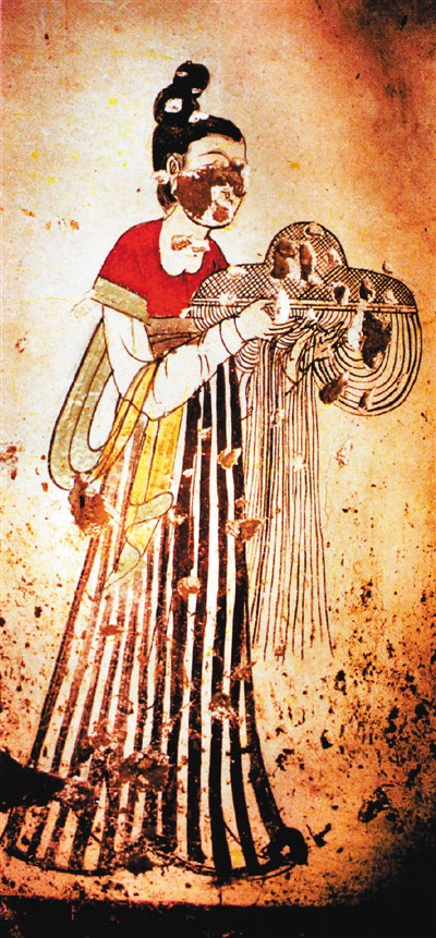 唐燕妃墓捧帷帽侍女壁畫,昭陵博物館藏。1990年,唐太宗的妃子燕氏的墓室被清理出來,墓室壁畫中,宮女手中所捧的帷帽垂掛著一圈長絲穗,形成一道薄幕,有一定衛(wèi)生防護功能。