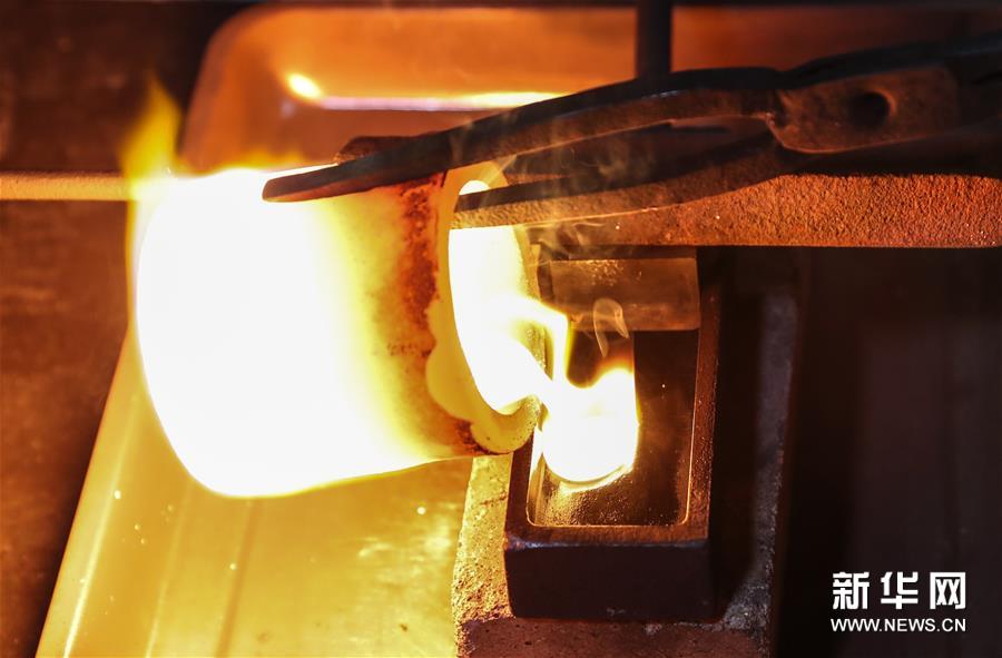 在南京金線金箔總廠,工人將熔化的金水倒入容器(2019年12月12日攝)。68歲的王必生是江蘇南京人,1973年進入南京金箔鍛制技藝項目保護單位——南京金線金箔總廠,師從老藝人譚柱石,他虛心學(xué)習(xí),潛心鉆研,很快掌握打金箔的技藝。他致力于技術(shù)革新和改造,參與機械打箔機、自動打箔機的研制。2009年他被評為國家級非物質(zhì)文化遺產(chǎn)項目南京金箔鍛制技藝代表性傳承人。 金箔鍛制技藝,俗稱“打金箔”,歷史悠久。在南京一些地方,金箔生產(chǎn)仍然延用古代傳下的制作工序,鍛制過程包括化金條、拍葉、做捻子、沾捻子、打開子、裝開子、出具、切箔等。 金箔廣泛應(yīng)用于建筑裝飾,還可應(yīng)用于雕塑、工藝品、書畫、食品藥品、服飾等方面的貼金裝飾和制作。南京金箔品種有真金箔、銅箔、銀箔、鋁箔,薄如蟬翼、色澤純正、厚薄均勻,產(chǎn)品銷往海內(nèi)外。 目前,王必生所在的南京金線金箔總廠是國家級非物質(zhì)文化遺產(chǎn)代表性項目保護單位。工廠把人工打金箔的遺址保護起來,并成立了金箔大師工作室,加強金箔技藝的推廣,加大傳承人的培養(yǎng)力度。已經(jīng)退休的王必生被工廠返聘,負責(zé)打箔技藝展示和傳承。他說,現(xiàn)在機器打箔越來越多,但人工打出的金箔的更加柔軟,齊整。他希望這一傳統(tǒng)技藝能夠繼續(xù)傳承下去。新華社記者 楊磊 攝