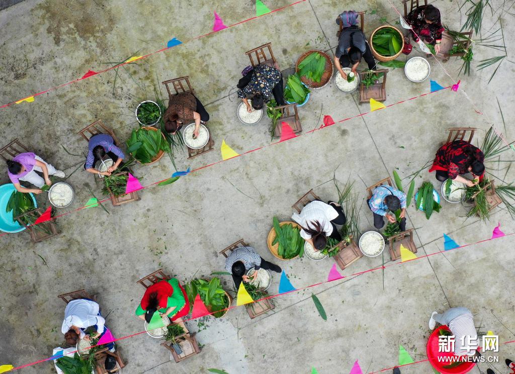 6月2日,貴州省銅仁市玉屏侗族自治縣亞魚鄉(xiāng)郭家灣村村民參加包粽子比賽(無人機(jī)照片)。端午節(jié)將至,貴州省銅仁市玉屏侗族自治縣亞魚鄉(xiāng)郭家灣村舉行“我們的節(jié)日,端午”群眾文化活動,村民們聚在一起比賽包粽子,喜迎端午節(jié)。新華社發(fā)(胡攀學(xué)攝)