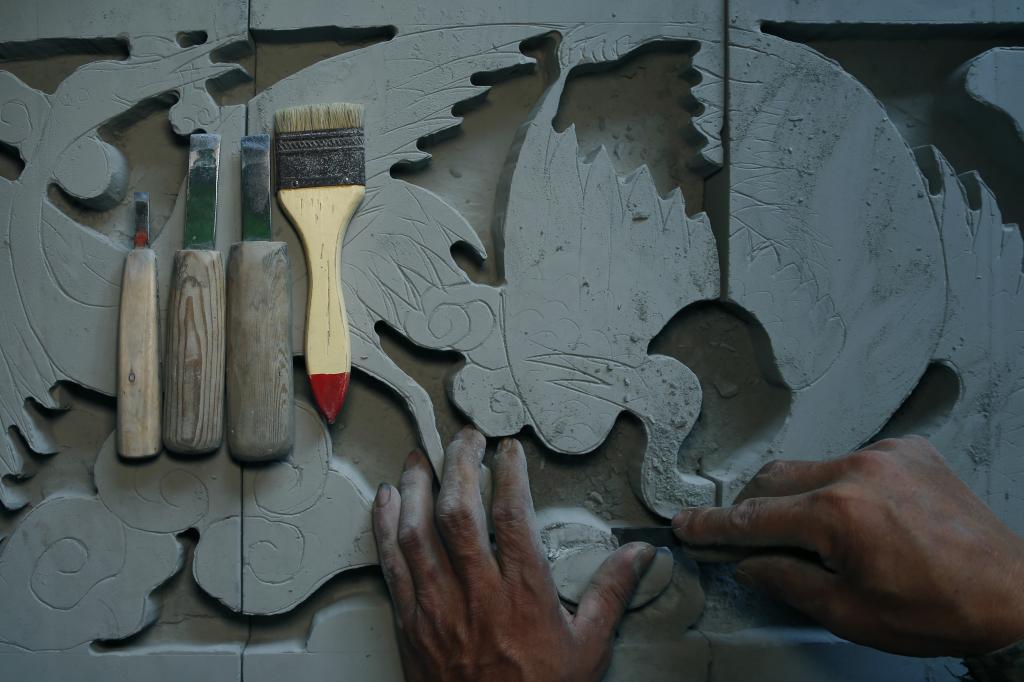 雕前先“打樣”:把設(shè)計(jì)稿拓印在涂抹過石灰水的磚面上,或者在磚塊上直接描畫?,F(xiàn)在許多外地磚雕加工廠多用電腦打樣,生產(chǎn)出來的是“制式”產(chǎn)品,千篇一律。磚雕常用的圖案王鎖貴早已爛熟于心,想要的圖案在青磚上一揮而就,當(dāng)真是“鐵劃銀鉤”、揮灑自如。如此,則構(gòu)圖更加生動(dòng),細(xì)節(jié)更加充盈,最主要的是絕不雷同。接下來“打坯”:用鑿子或刻刀粗略勾勒畫面輪廓,分出基本層次。最后是“出細(xì)”:運(yùn)用多種工具,或鏟、或刻、或挑,以刻畫細(xì)節(jié)。