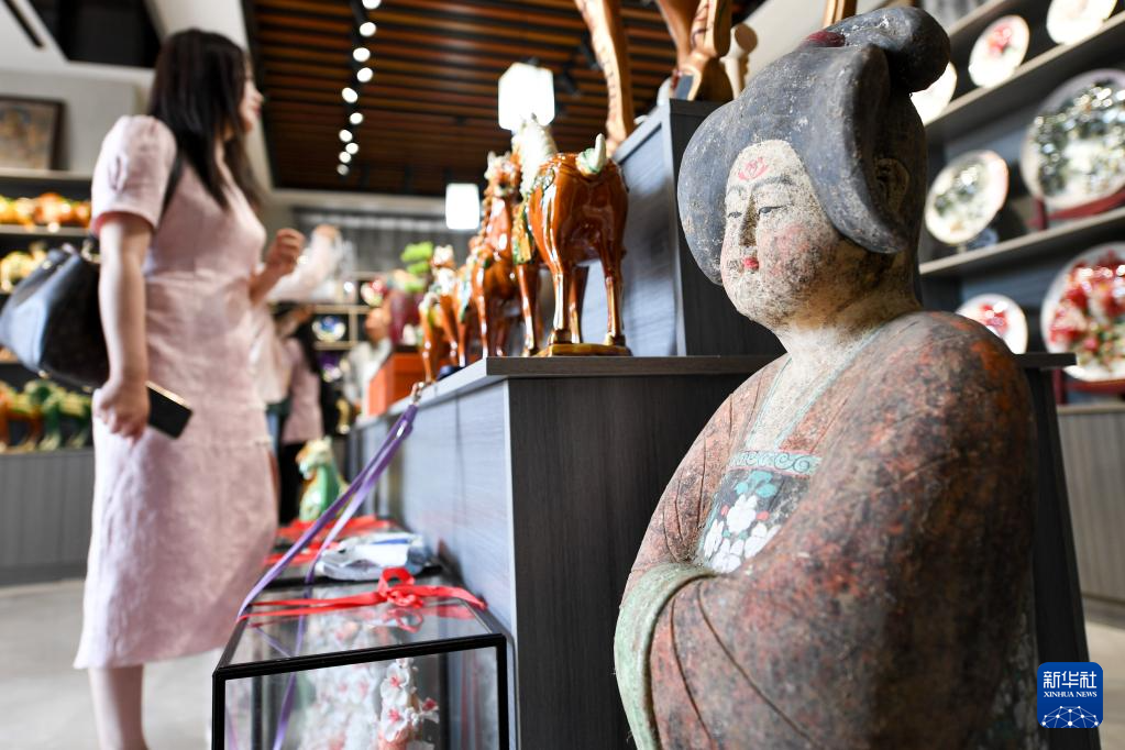 6月6日,游客在南石山村的唐三彩商鋪內選購商品。