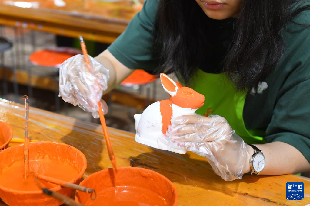 6月6日,一名體驗者在唐三彩文化研學所為唐三彩素胎施釉。