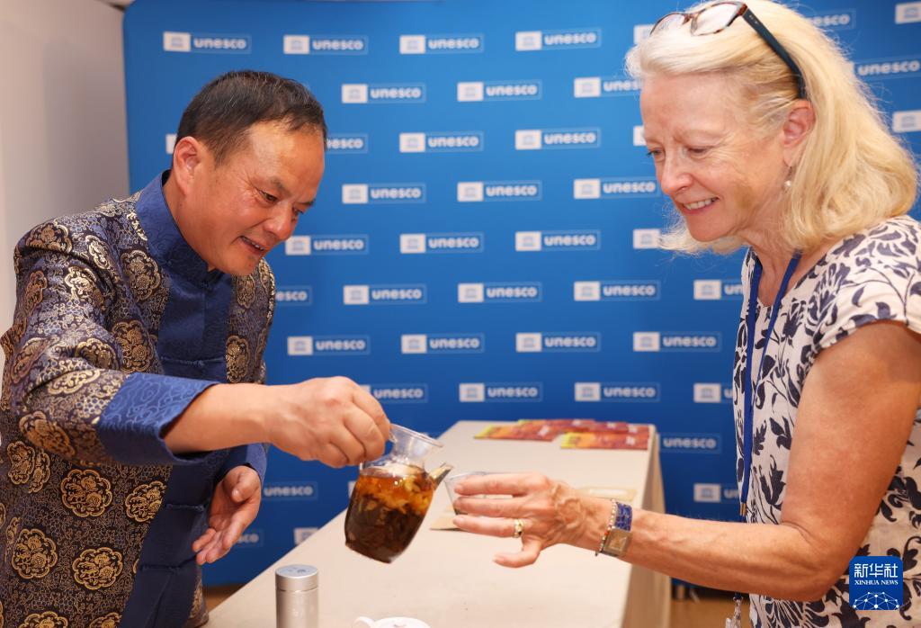 7月11日,在位于法國(guó)巴黎的聯(lián)合國(guó)教科文組織總部,嘉賓品嘗南京雨花茶。新華社記者 高靜 攝