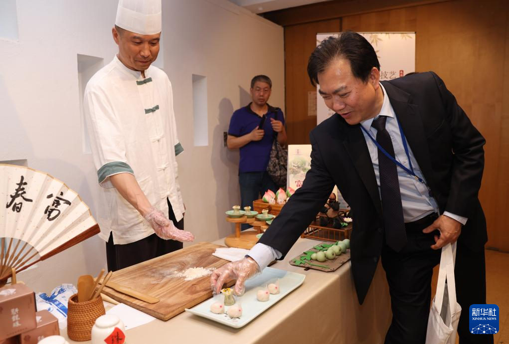 7月11日,在位于法國(guó)巴黎的聯(lián)合國(guó)教科文組織總部,南京雨花茶傳承人陳盛峰演示制作雨花茶。