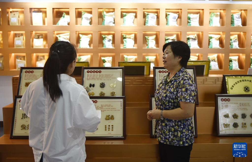 8月4日,在禹州中醫(yī)藥文化技藝傳習(xí)館,非遺項(xiàng)目“禹州中藥加工炮制技藝”代表性傳承人朱改蓮(左)向參觀者介紹中藥材知識(shí)。