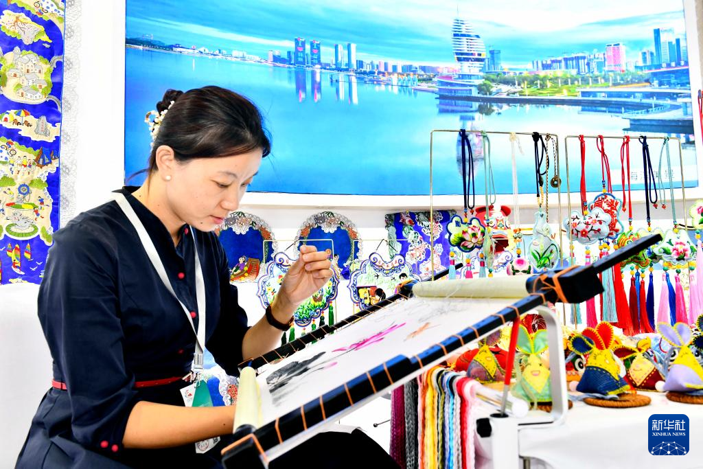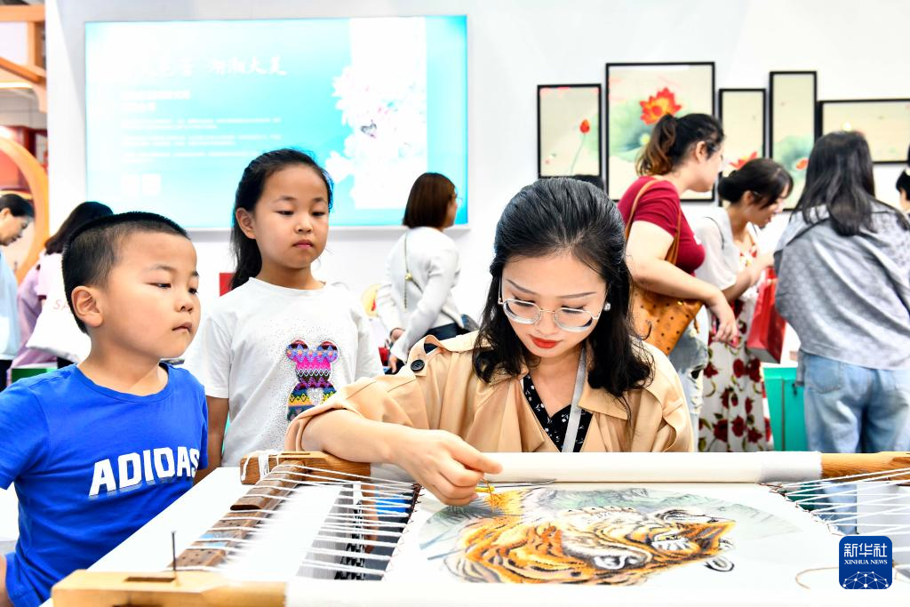 9月16日,在山東國(guó)際會(huì)展中心,來(lái)自湖南的非遺傳承人現(xiàn)場(chǎng)展示湘繡技藝。