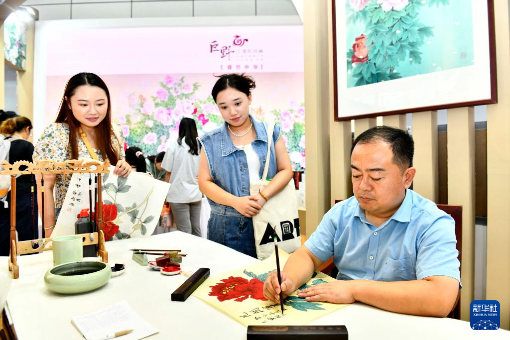 9月16日,在山東國(guó)際會(huì)展中心,來(lái)自巨野書(shū)畫(huà)院的藝術(shù)工作者侯福常(右一)在展示工筆牡丹畫(huà)技藝。