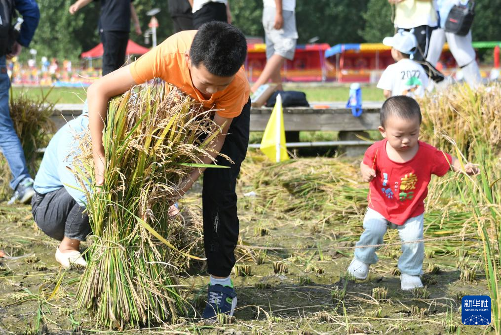 9月23日,在北京市海淀區(qū)上莊鎮(zhèn)西馬坊京西稻田,小朋友在活動中參加割稻子比賽。
