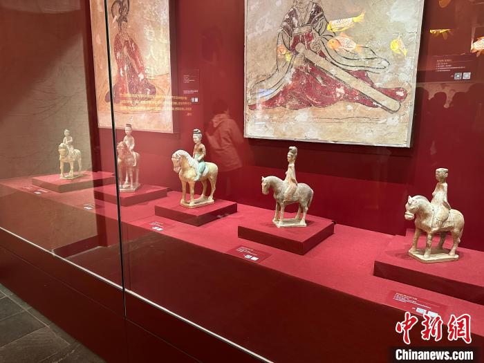 唐墓中的壁畫(huà)和彩色陶俑是唐代極具代表性的藝術(shù)珍品。記者在展廳看到,女性陶俑類(lèi)型多樣,各種女坐俑、立俑、侍俑、樂(lè)舞俑、騎馬俑、貴婦俑……這些女俑造型生動(dòng),尤其是三彩女俑,釉色艷麗,呈現(xiàn)了唐代女性“千人千面”的生存狀態(tài)。
