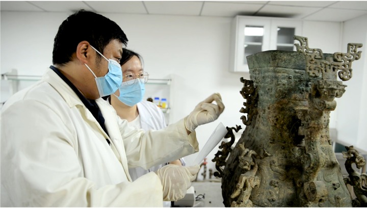 此外,為了堅持“最小干預”原則,保證文物真實性,此次修復并沒有對蓮鶴方壺進行統(tǒng)一著色。“我們著重清理了有害銹,而記錄著文物信息的無害銹得到原汁原味保留,紅斑處留紅,綠銹處存綠,保留文物的歷史信息?!倍虐舱f。