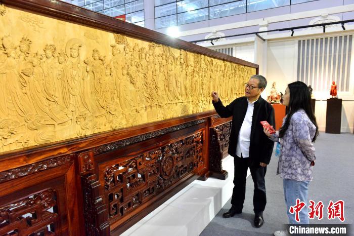 5月9日,第四屆中國工藝美術(shù)博覽會在福建福州啟幕,圖為雕漆作品《凈土文化對瓶》吸引觀展者目光。 中新網(wǎng)記者 呂明 攝 “這個作品是我和三個徒弟,花費了12年時間做成的?!睋?jù)袁師永介紹,雕漆作品《凈土文化對瓶》的瓶身分別高兩米八、寬一米四,這對對瓶一共雕刻了270位人物?!斑@是從佛經(jīng)里衍生出來的人物,270位人物都有他的故事,所以動作、造型等都不一樣。” 看著這對作品,袁師永可謂春風(fēng)得意。他告訴記者,光刷朱砂漆就刷了兩百多層的厚度,而后又用傳統(tǒng)的雕刻刀慢慢地雕琢,展出前還在不停地加工調(diào)整。 第四屆中國工藝美術(shù)博覽會期間,“中國工藝美術(shù)大師袁師永師徒‘福漆’技藝傳承展”也于此間舉行。傳承展集中展示了袁師永及其十余位傳承人、徒弟的合作作品,涵蓋福州生漆脫胎髹飾技藝大型造像藝術(shù)作品與唐卡漆畫作品等。