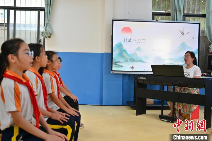 6月12日,音樂教師李麗帶領(lǐng)學(xué)生演唱壯族嘹歌。 俞靖 攝