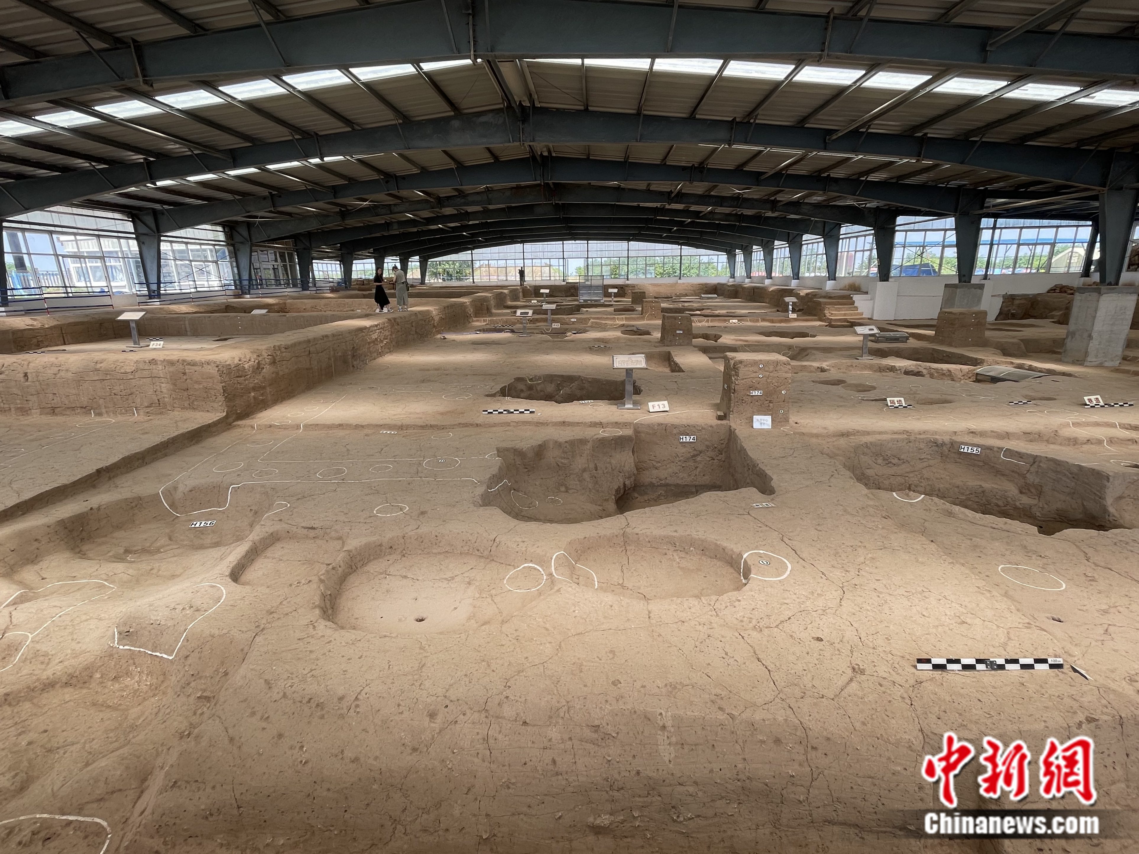 雙槐樹遺址北依黃河,西瀕伊洛河,南望嵩山,恰好位于伊洛河與黃河交匯處的高臺地上。受黃河改道影響,雙槐樹遺址北部被侵蝕,現(xiàn)存面積約117萬平方米,發(fā)現(xiàn)有仰韶文化中晚階段三重大型環(huán)壕、圍墻封閉式大型中心居址區(qū)、院落式夯土基址、四處經(jīng)過嚴格規(guī)劃的大型公共墓地、三處夯土祭壇等重要遺跡,并出土了豐富的仰韶文化遺物。