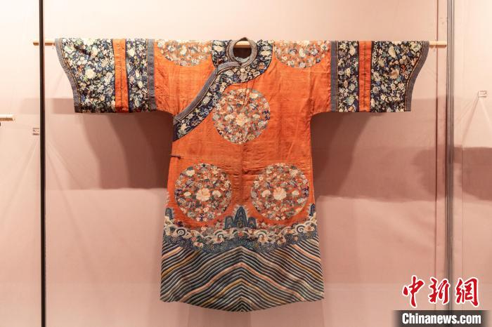 中新網(wǎng)北京10月10日電 題:探訪“五彩錦簇——中華服飾文化展”:民族交融史書藏于華服 中新網(wǎng)記者 孫更亭 服飾,被稱為“穿在身上的史書”。近日,中國工藝美術(shù)館(中國非物質(zhì)文化遺產(chǎn)館)“五彩錦簇——中華服飾文化展”展廳內(nèi)的觀眾絡(luò)繹不絕??聽柨俗巫謇C花女袍、赫哲族魚皮衣、藏族銀腰飾……展覽匯聚了多個民族的特色服飾,款式多樣、材質(zhì)紛繁、工藝精湛、色彩絢麗,堪稱一場服飾文化盛宴。 置身廳內(nèi),200余件服飾述說著各民族在交往交流交融中不斷發(fā)展的歷史脈絡(luò)與中華服飾文化綿延不斷的生命力。步入“多元一體”民族服飾展廳,一件“滿族緙絲紅地八團花卉紋吉服袍”引人注目。 這件吉服袍為清代滿族貴族女性在儀禮場合穿用,其基本形制為圓領(lǐng)、右衽、闊袖,衣身兩開據(jù)。胸背、兩肩及前后下擺處緙織八團暗八仙花卉紋,底擺緙織海水江崖紋,整體裝飾紋樣繁復(fù)華麗、寓意吉祥美滿。
