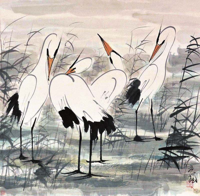 到了近現(xiàn)代,傳統(tǒng)文藝思想開始發(fā)生轉(zhuǎn)變,呂澂、康有為等人在繪畫領(lǐng)域提出改良思想,鶴主題的繪畫也有所變化。在林風(fēng)眠創(chuàng)作的《群鶴圖》《雙鶴圖》《白鶴》等作品中,既可以看到中國畫白描的影子,又可以感受到西方速寫技法的影響。《群鶴圖》由幾只立于廣袤水草的白鶴構(gòu)成,它們姿態(tài)各不相同。與鶴之閑適姿態(tài)相對(duì)應(yīng)的是隨風(fēng)浮動(dòng)的蘆葦,它們?cè)谖L(fēng)吹拂下雖形態(tài)萬千,但并不雜亂,在總體偏暗的色調(diào)中顯出和諧之味。《雙鶴圖》表現(xiàn)了鶴的輕盈姿態(tài),兩只鶴步伐保持一致,展示出閑適自得之感。林風(fēng)眠筆下的鶴,顯然沒有古代繪畫中仙風(fēng)道骨、富貴長壽之意,與寫意之鶴相比,其作品里的鶴與自然萬物融為一體,表達(dá)出強(qiáng)有力的現(xiàn)代語言。