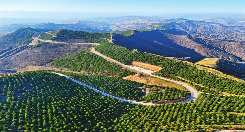 邊塞重地,長年征戰(zhàn),風(fēng)沙肆虐,溝壑縱橫。特殊的地理位置和惡劣的氣候條件,導(dǎo)致偏關(guān)的原始植被幾近絕跡。偏關(guān)人一年中有半年在植樹造林,人工搬苗,人工運(yùn)水,從山下到山上,再從山上到山下,來回往返,汗水淌過春夏秋冬,足跡踏遍山嶺圪梁。為減少水土流失,他們在山坡上挖交錯排列的魚鱗坑,以貯存“貴如油”的雨水,為油松提供有限的囊盡天地之饋贈的水肥。淺淺的土層,種不下高頭大樹,僅能讓幾十厘米的油松保持直立。偏關(guān)人誓將“荒山”變“綠山”,“換書記不換主意,換縣長不換主張”“一任接著一任干,一級干給一級看”……以堅韌之力重塑山河、治理生態(tài),以愚公之力見縫插綠、逢山播綠,以“饅頭加镢頭、燴菜加會戰(zhàn)”的不屈精神,年年歲歲,綠色接力,將偏關(guān)打造成全省生態(tài)建設(shè)紅旗縣,黃河流域生態(tài)文明建設(shè)先進(jìn)縣,在不毛之地寫下綠色詩行,筑起綠色長城。