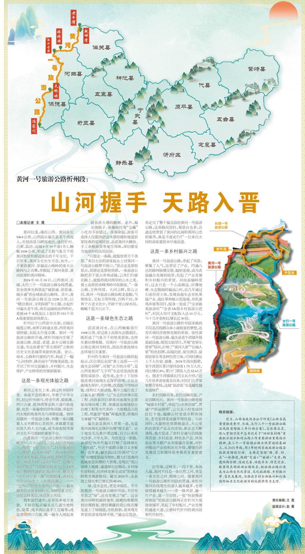 2024年10月18日,山西黃河、長城、太行三個一號旅游公路全線貫通,在全國率先構筑起“城景通、景景通、城鄉(xiāng)通”的全域旅游公路網。其中,黃河一號旅游公路長達1238公里,以“踏訪黃河、文明探源”為主題,北起忻州偏關老牛灣,南至運城垣曲西哄村,連接65個A級及以上景區(qū)和153個非A級重要旅游資源點。