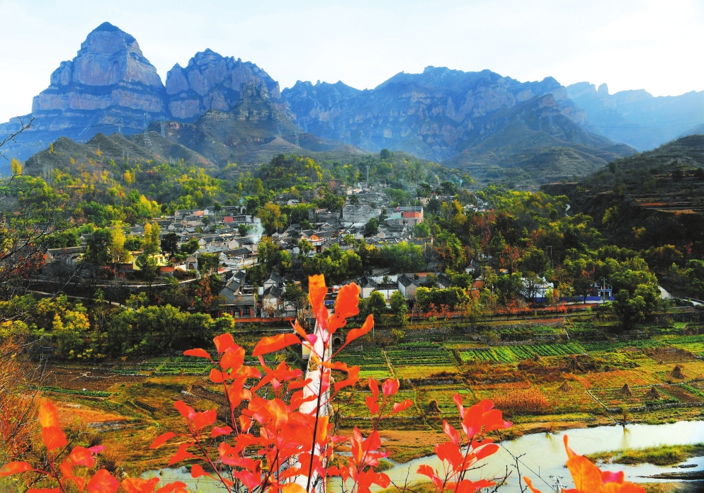 秋天的南莊是一個(gè)多彩的海洋。黃櫨和椿樹的紅葉像晚霞一樣映紅了山崖與河谷;燈籠一樣的金黃色柿子色澤誘人,掛在高高的柿樹上;依舊翠綠的花椒樹枝頭,一簇簇鮮紅的花椒若隱若現(xiàn);婆娑的黑棗樹上星星點(diǎn)點(diǎn),長滿褐色的果實(shí),沉甸甸的,壓彎了樹梢。