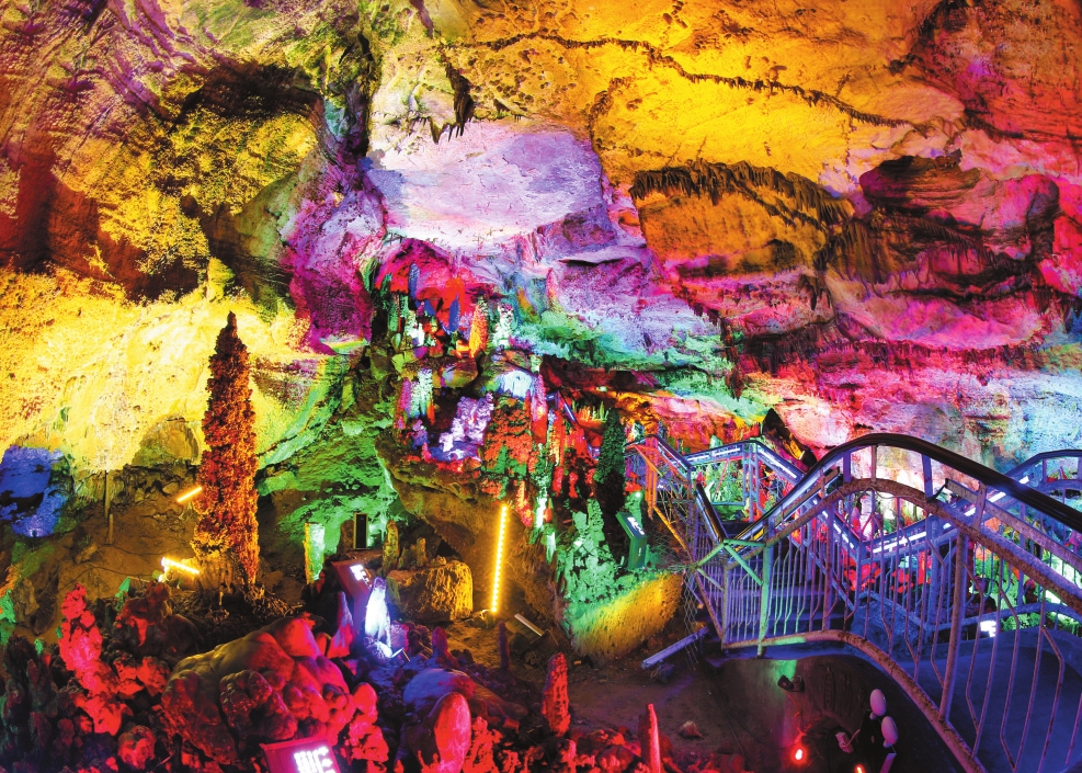 游客沿著精心設(shè)計(jì)的路線,可觀賞50多個(gè)景點(diǎn)。其中“群獅迎賓”,洞口一組石筍形似雄獅列隊(duì),栩栩如生;“金龜出洞”,巨石形成的龜狀奇石,仿佛正探秘人間;“瑤池仙境”與“蓬萊仙島”,燈光下的石幔如天宮云霞;“鎮(zhèn)海寶塔”,高1.8米的花團(tuán)狀石塔,景象奇麗。最令人驚嘆的是洞內(nèi)的“冰瀑世界”。在水晶洞和一線天區(qū)域,巖溶從洞頂傾瀉而下,形成各種瀑布奇觀:有如長白山瀑布的白練懸空,有如黃果樹瀑布的氣勢(shì)恢宏,還有黃巖大瀑布的玲瓏剔透。一處名為“禹王觀瀑”的景點(diǎn),更讓游人仿佛看見大禹治水時(shí)三過家門而不入的身影。