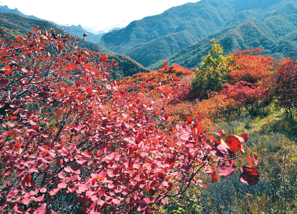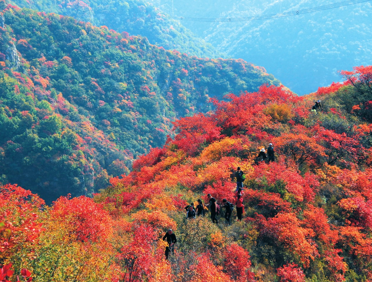 紅葉谷是一條長達(dá)十幾公里的狹長山谷,開闊處大如庭院,狹窄處頭頂只露一線天空。每到秋季,紅葉樹仿佛約好似的于山谷間競相爭艷,紅色或淺或深,紅綠相間、紅黃浸染,一片紅葉繽紛的世界。