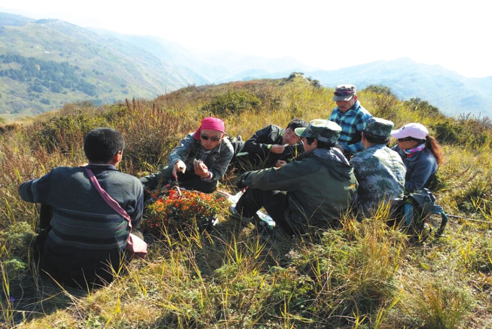 再往上走,是一個(gè)巨石崖,更險(xiǎn)更難了,要一步一停挪移,手攀著,人扶著、坐著、爬著前進(jìn)。隊(duì)友個(gè)個(gè)揮汗如雨,水壺里的水快喝完了,只能小抿一下潤潤嗓子。過了巨石崖,又是一片荊棘林??斓缴巾?shù)臅r(shí)候,眼前變得開闊,腳下是一片草甸。快步走過草甸,上到了柳林尖最頂端。無限風(fēng)光在險(xiǎn)峰,好一片莽莽蒼蒼的大好河山。