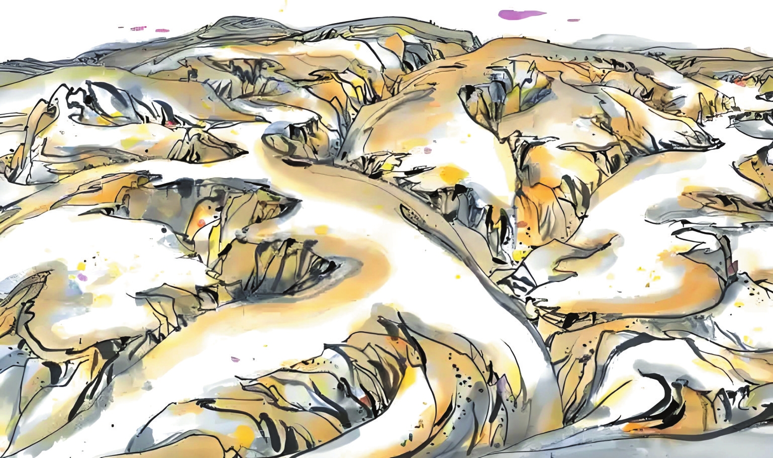 1989年10月的河曲寫生,是吳冠中藝術(shù)生涯的重要轉(zhuǎn)折點。在陪同的學(xué)生王秦生引導(dǎo)下,這位古稀老人尋找“黃土荒漠之典型地區(qū)”,最終駐足晉西北河曲縣。每日晨起,他面對被雨水沖刷、滿山皆溝壑的地貌,靜心思考,猛然產(chǎn)生了驚人的藝術(shù)聯(lián)想——起伏的山形如同眾多老虎,而那些溝壑恰似老虎皮毛上的斑紋。他在《出現(xiàn)老虎》一文中寫道:“我終于發(fā)現(xiàn)黃土高原是展拓了的老虎之群,其間伏臥著無數(shù)猛虎,有的正將躍起,有的還在酣睡。作完數(shù)幅黃土高原,意猶未盡,于是我畫起老虎來。”這種將地理特征轉(zhuǎn)化為藝術(shù)創(chuàng)作標志著吳冠中完成“從風(fēng)景寫生到精神寫意”的蛻變,其價值在于為現(xiàn)代中國畫開辟了根植本土、融貫中西的新路徑。一個月河曲翠峰山寫生之旅誕生的《老虎高原》,更以極富樂感的線條勾勒出這片土地精神的圖騰。