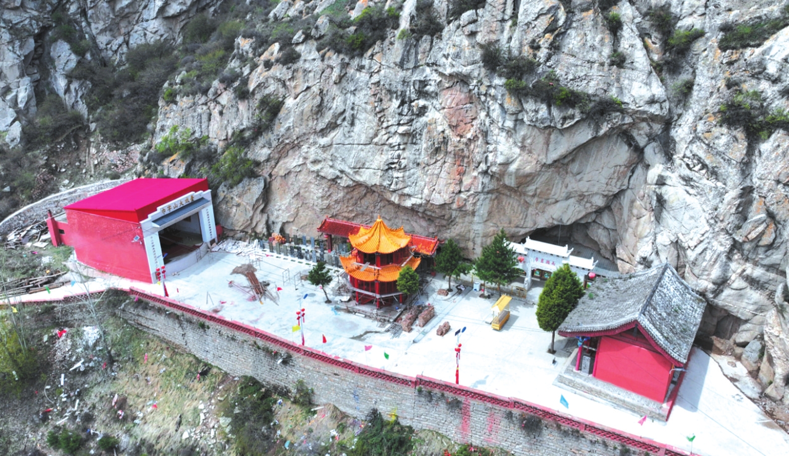 春日里,山桃花與山杏花沿坡綻放,粉白相間的花海從山腳漫至山腰,與翠綠的松柏相映成趣。此時(shí)若恰逢細(xì)雨,云霧在花間游走,“巾巖瀨雨”的奇景尤為靈動(dòng),水滴擊石的清音與花開的簌簌聲交織,仿佛天地間的私語(yǔ)。盛夏時(shí)節(jié),山中松濤陣陣,涼意襲人。雙巾峰下的“沁心泉”水量充沛,泉水清冽甘醇,飲之可去暑熱。沿山路行至“回音壁”,一聲呼喊能引來(lái)七聲回應(yīng),故又稱“七響巖”。傍晚時(shí)分,夕陽(yáng)為石灰?guī)r峰巒鍍上金邊,池面波光粼粼,形成“巾峰夕照”的景致,與“瀨雨”并稱山中雙絕。秋日登高,則見株株松樹挺拔直立,廟宇與油松交相輝映,層林盡染。此時(shí)“瀨雨”之景尤為別致,洞內(nèi)泉水如鐘表滴答,當(dāng)?shù)厝朔Q為“秋漏”。有現(xiàn)代詩(shī)人描繪此景:“巾巖雄峙,霧繞云纏多靈氣;瀨雨淋漓,珠垂墜玉一奇觀?!毙蜗蟮匕炎匀恢襞c時(shí)間之感巧妙融合。冬雪初霽時(shí),巾字山銀裝素裹,雙巾峰如白玉雕琢的冠冕,“瀨雨”洞洞外凝結(jié)的冰棱如水晶簾幕,陽(yáng)光折射下七彩斑斕,構(gòu)成冬日里的清麗樂章。