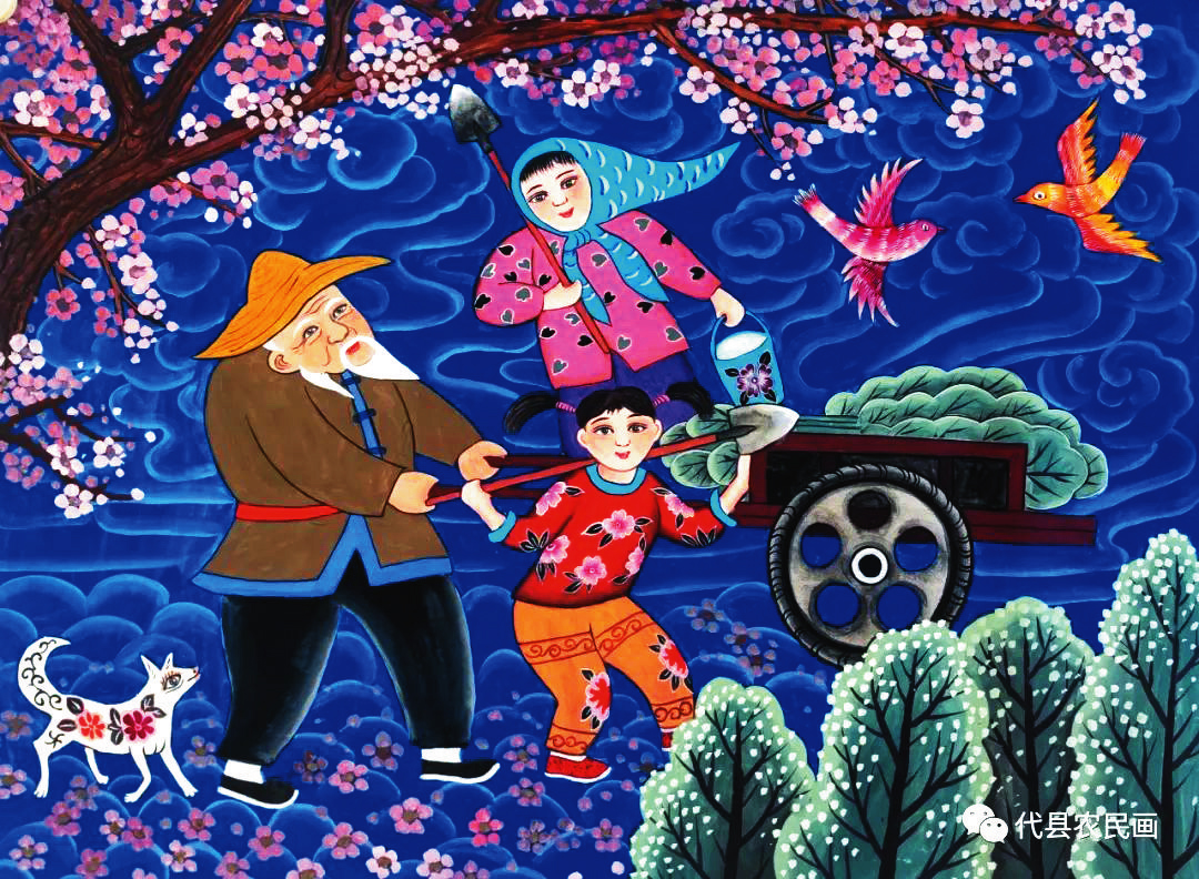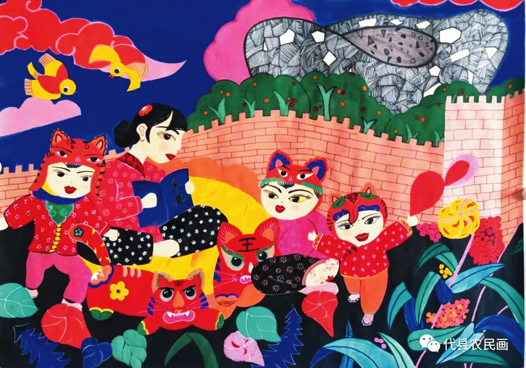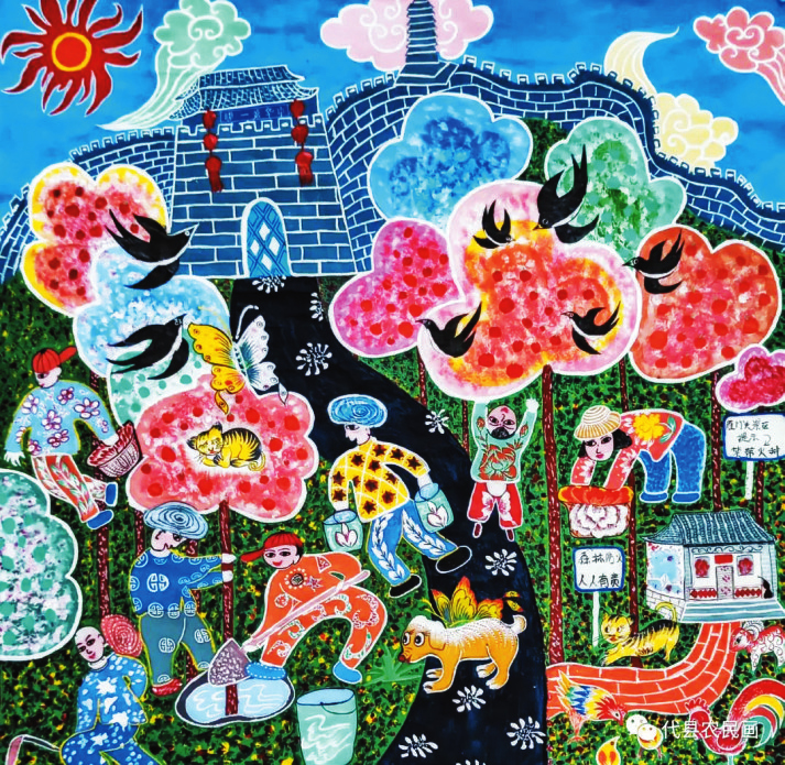 戴翠平《雁門關(guān)下護(hù)林忙》 在代縣農(nóng)民畫促進(jìn)會黨支部和主席團(tuán)的引領(lǐng)下,這些女畫家積極參與促進(jìn)會組織的各種交流和研討活動,不斷汲取藝術(shù)養(yǎng)分,深入探索研究農(nóng)民畫的創(chuàng)作技巧,使自己的繪畫技藝逐漸得到提升。她們特別注重借鑒代縣刺繡、面塑、剪紙等民間技藝的創(chuàng)作方法,從各種技藝當(dāng)中吸納有利于農(nóng)民畫創(chuàng)作的元素和營養(yǎng)。
