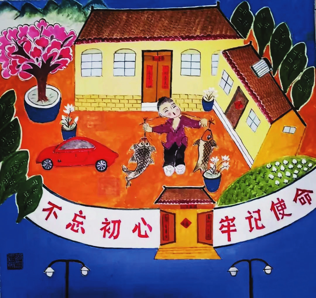 李愛英《不忘初心》 中國歷史文化名城代縣,文化底蘊(yùn)深厚,民俗傳統(tǒng)技藝精巧別致,1988年和2008年先后被文化部授予“中國民間繪畫畫鄉(xiāng)”“中國民間文化藝術(shù)之鄉(xiāng)”。該縣的農(nóng)民畫早在上世紀(jì)80年代初就在全國產(chǎn)生過較大影響,之后經(jīng)歷了一段低迷期。近年來在代縣農(nóng)民畫促進(jìn)會的推動之下,農(nóng)民畫又重新煥發(fā)出耀眼的光彩。先后涌現(xiàn)出多位畫家,其中尤以丁全愛、戴翠平、祁磊、賈永花、郎冬梅等18位女畫家組陣的雁門巾幗,在多年鉆研繪畫技巧的基礎(chǔ)上,創(chuàng)作出一幅幅特色鮮明、獨(dú)具匠心的畫作,成為閃耀三晉大地的矩陣,為傳承、弘揚(yáng)雁門文化做出了新貢獻(xiàn)。